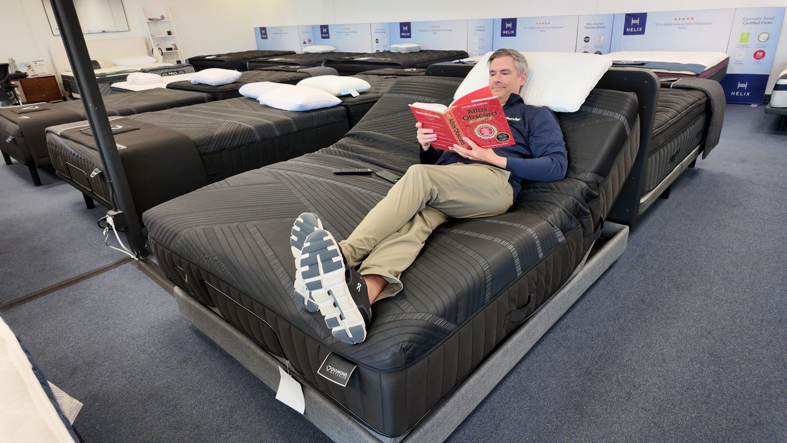 It tilts the entire flat mattress up to 7 degrees. You get the benefits of elevation (great for reflux or snoring) without the back-breaking curve.