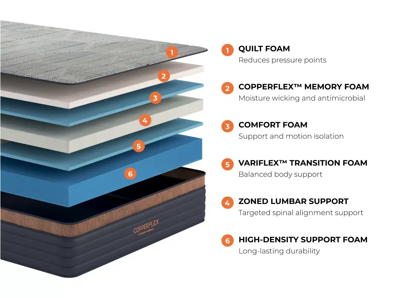 CopperFlex® foam is infused with copper beads. This offers two key benefits: Thermal Conductivity (drawing heat away from the body) and Antimicrobial protection (killing bacteria and keeping the mattress fresh).