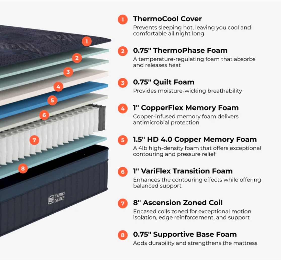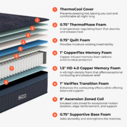 - CopperFlex Memory Foam: Copper is naturally antimicrobial and a great conductor, helping to further dissipate heat while providing pressure relief.